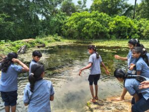 In Adhivanam, students actively participate in planting saplings, watering plants, preparing natural fertilizers, and understanding traditional farming methods